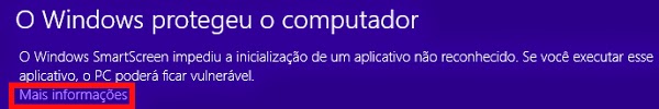 Caso você use o Windows 8, pode aparecer uma mensagem com a frase O Windows protegeu o seu computador, na qual você clicará na opção Mais informações: