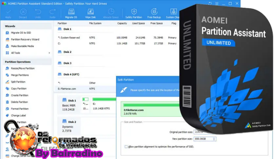 O AOMEI Partition Assistant é um software completo e fácil de usar para particionamento de discos rígidos. Ele oferece diversos recursos gratuitos de gerenciamento de partições, tanto para usuários domésticos quanto comerciais. O AOMEI Partition Assistant garante todos os recursos para criar, redimensionar, mover, copiar, excluir, apagar, alinhar, formatar, mesclar, dividir partições e muito mais.