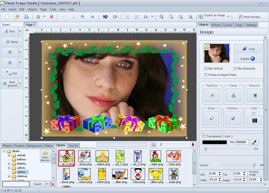 Você também pode criar sua própria composição. Isso pode ser feito graças às ferramentas que nos permitem adicionar vários elementos tais como números clip-peças ou textos marcantes. Você também pode calibrar imagens, assim você pode cortá-los, ampliar a visão que combina com você e se livrar do efeito de olhos vermelhos.